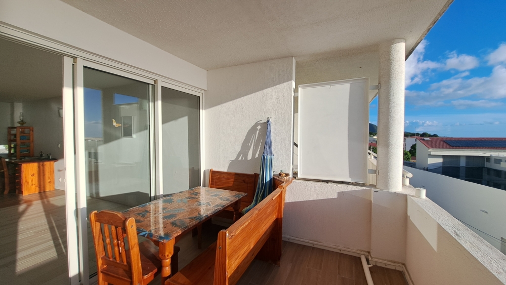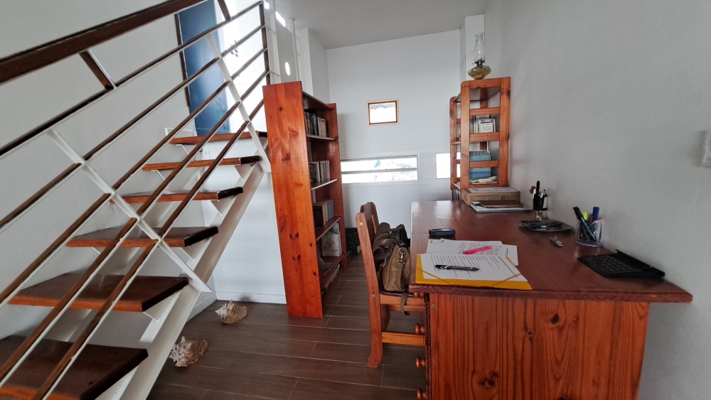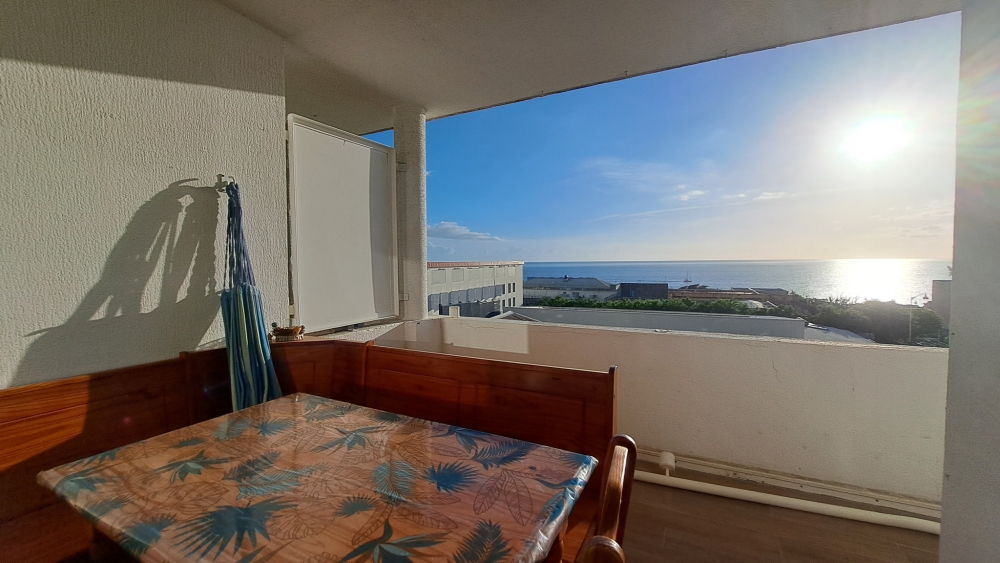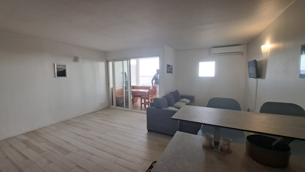 Niveau principal : un salon-séjour spacieux lumineux, idéal pour créer un espace de vie convivial, un dégagement aménagé en coin bureau, une cuisine ouverte sur le séjour, un balcon avec vue mer.