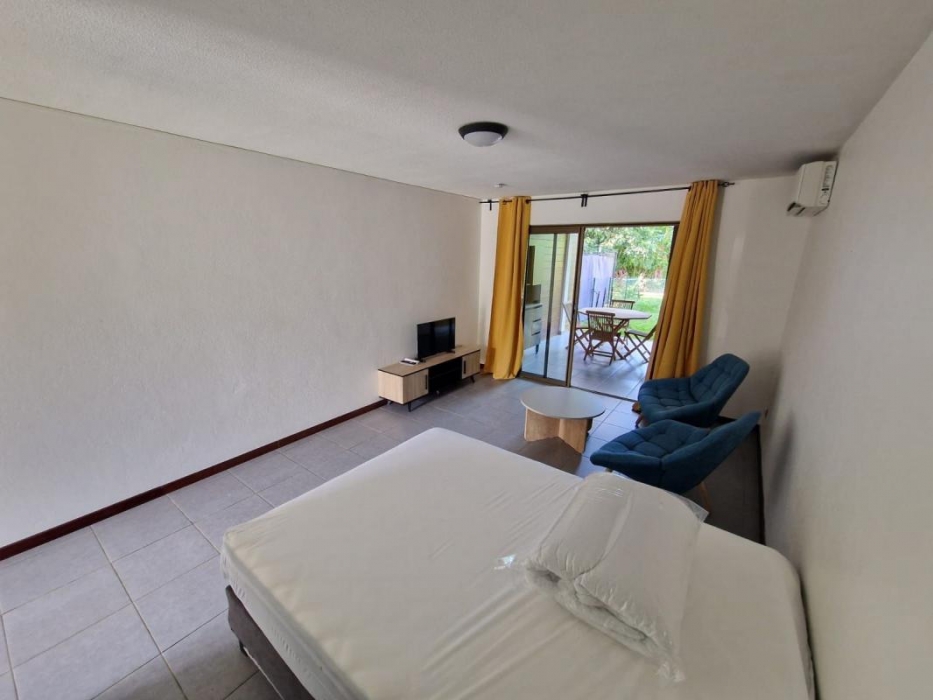 Route des plages, dans une résidence de prestige avec piscine, parking et Régisseur. Profitez d'un spacieux appartement T1 meublé, comprenant : - une pièce principale climatisée avec placard aménagé, un lit deux places, un espace TV - une salle d'eau avec rangement - une chaleureuse varangue avec table à manger - une cuisine aménagée et entièrement équipée (réfrigérateur, plaque de cuisson vitrocéramique, four/grill, machine à laver, mixeur, cafetière , ménagère, vaisselles...) . Environnement calme et paisible proche de la mer et du sentier du Rorota. Aucun vis-à-vis, vue sur la verdure.