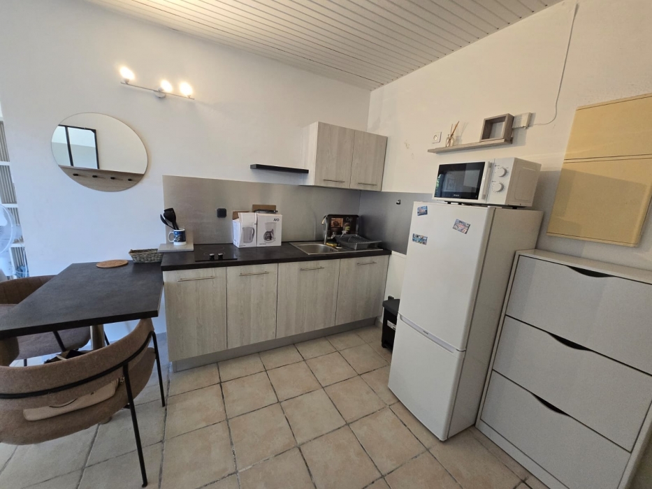 Il dispose d'une pièce principale avec un coin nuit et une cuisine très bien équipée, une jolie salle d'eau avec WC et une buanderie extérieure avec machine à laver. Propre et très bien équipé, cet appartement vous séduira.