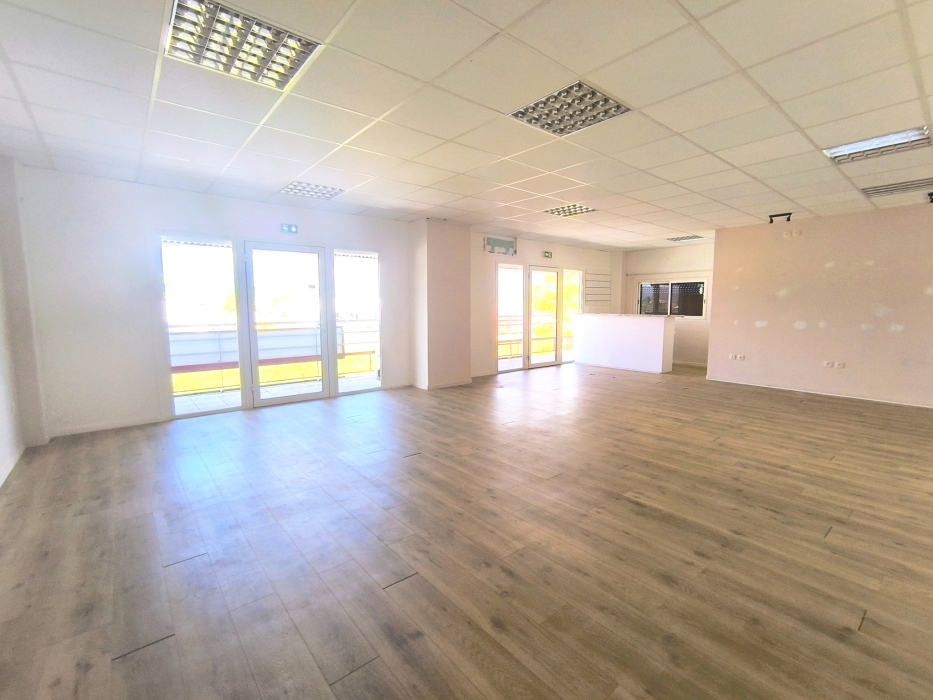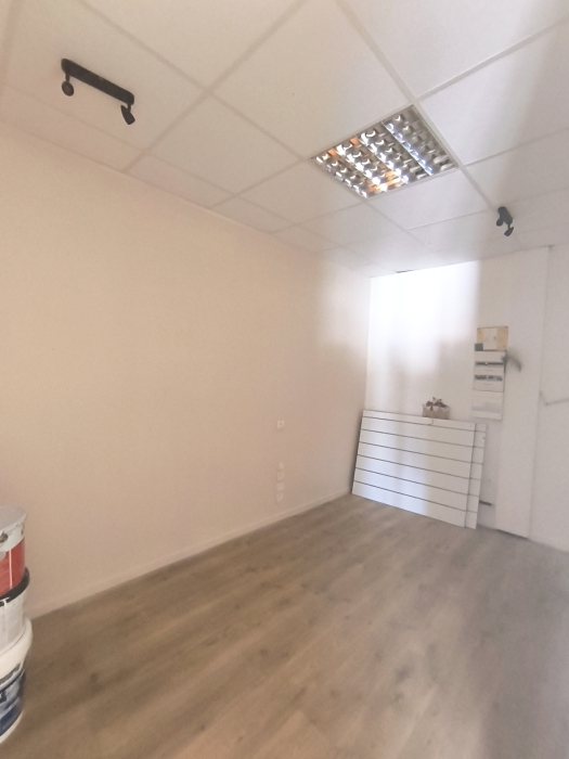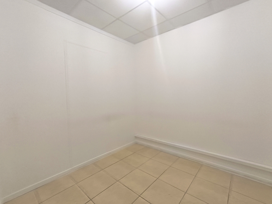 une grande salle lumineuse avec un accueil, deux vitines et deux entrées distinctes, un bureau, une pièce pouvant servir de stockage et des sanitaires.