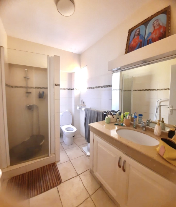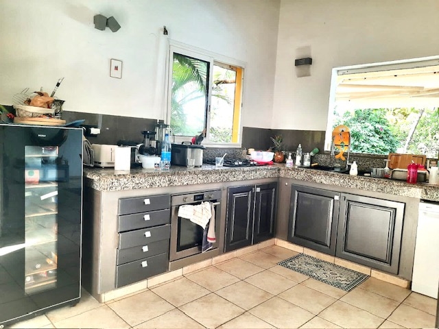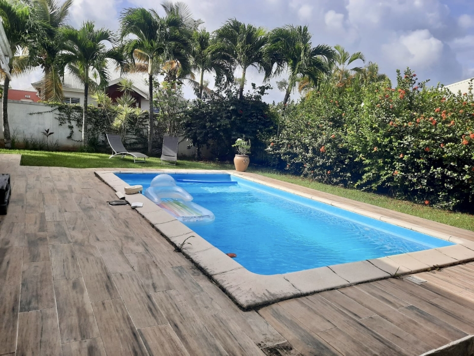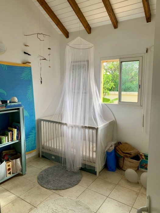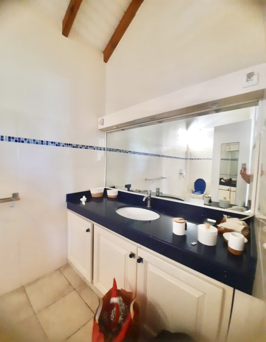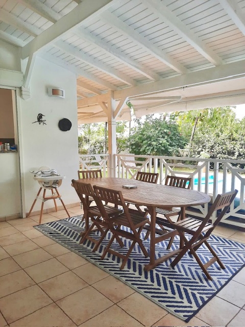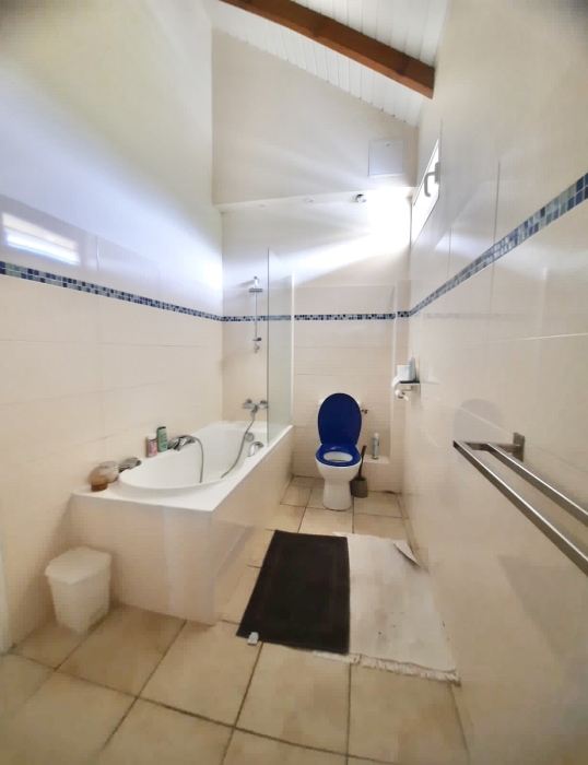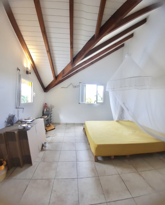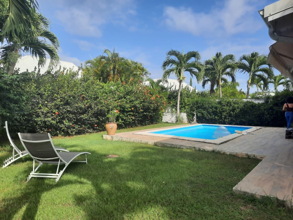 A louer dans le secteur de Dampierre à Gosier, une villa jumelée de type T4 sur deux niveaux, comprenant, au RDC, un spacieux séjour avec une belle hauteur sous plafond, une cuisine ouverte aménagée et équipée (four, plaque de cuisson), un cellier, deux chambres climatisées avec placards, une salle d'eau avec WC, un WC indépendant, une terrasse agréable donnant sur la piscine et le jardin. A l'étage, une chambre climatisée avec salle de bain attenante et WC.