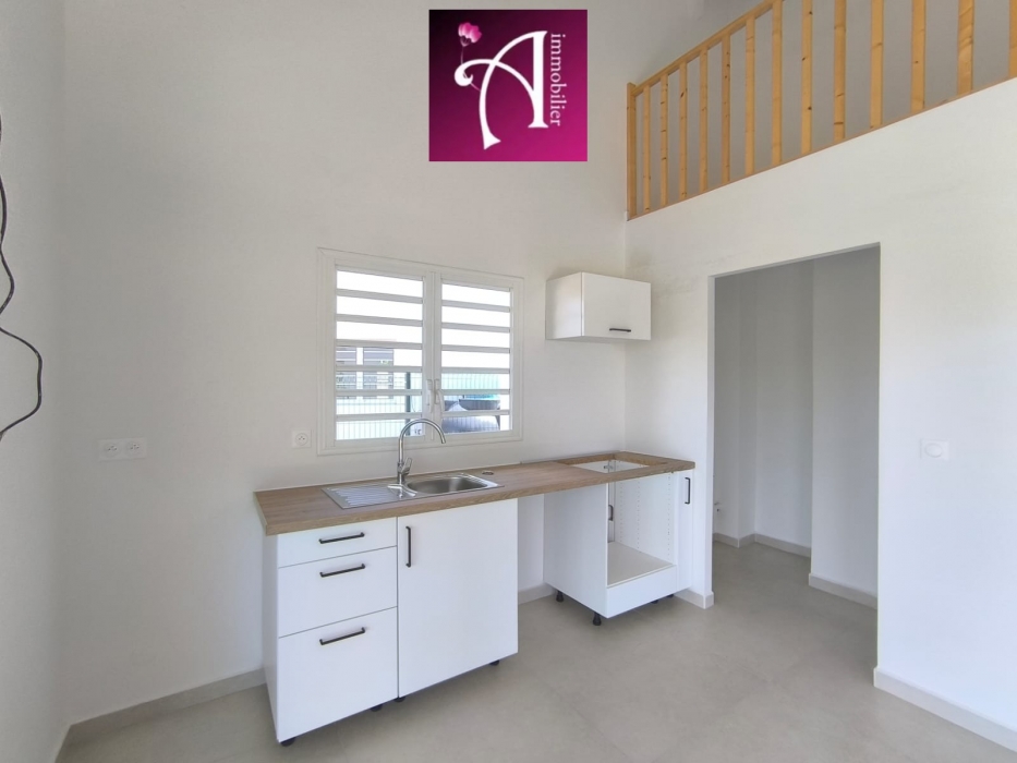 La maison se compose d'un séjour lumineux avec de grandes baies vitrées ouvrant sur la terrasse, ainsi que d'une cuisine semi-équipée avec meubles de rangement. Un cellier attenant vient compléter cet espace pratique et convivial.