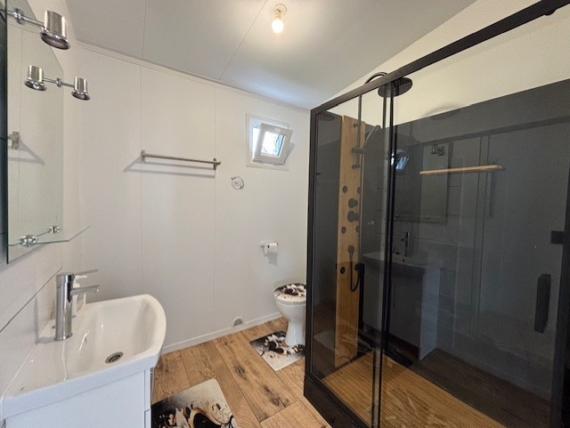 Entrez par un séjour équipé, puis dirigez-vous vers le coin cuisine qui vous mènera à un bureau climatisé, une salle d'eau avec toilettes et une chambre avec son accès à une terrasse privative.