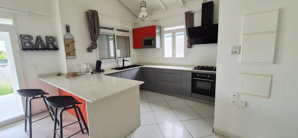 Composée d'une cuisine avec cellier attenant complètement aménagée et équipée, ouverte sur le salon, trois chambres climatisées dont une suite parentale avec salle d'eau et dressing, une seconde salle d'eau et un WC indépendant, une terrasse en L sans aucun vis à vis, citerne d'eau et portail électrique.