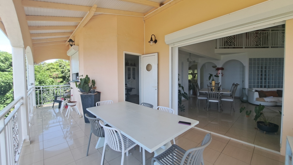 Découvrez cette superbe villa familiale répartie sur trois niveaux, offrant de très beaux volumes, avec un grand jardin entièrement clôturé et une vue mer dégagée sur l'archipel des Saintes. Cette villa comprend :