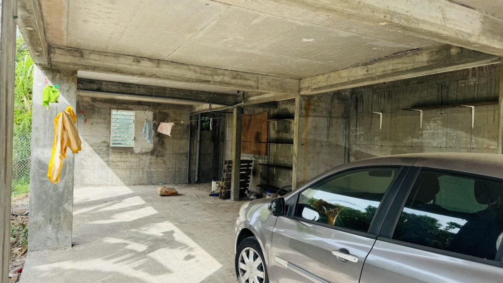 Un grand garage couvert et ouvert en sous-sol est désservi par une allée extérieure.