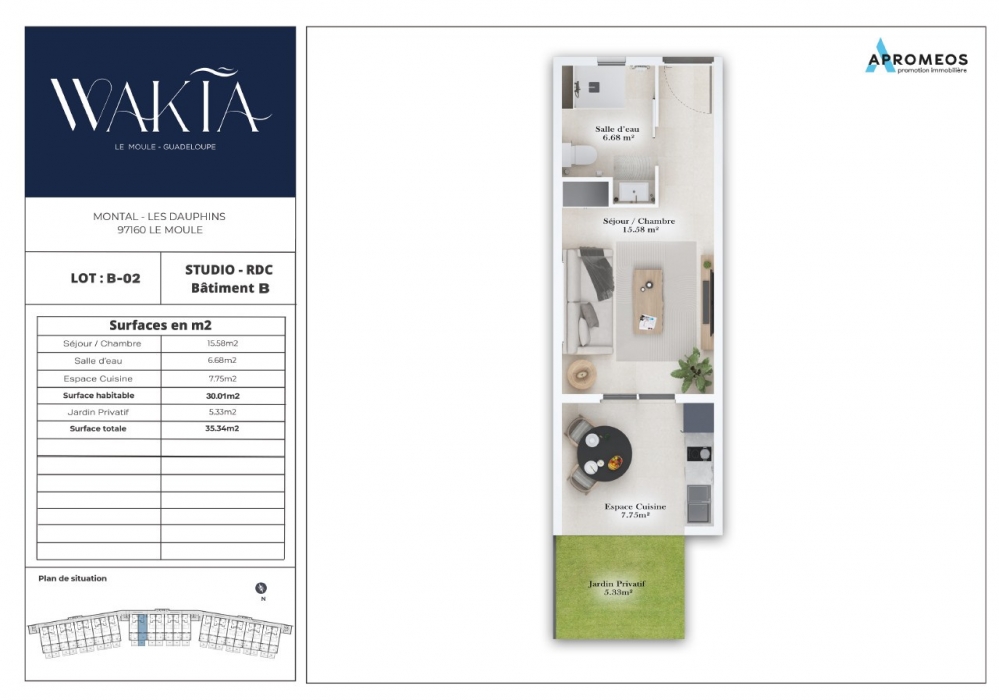 Sur la plage de Montal (aussi appelé 'plage des dauphins'), à 5mn du centre ville du Moule, la résidence Wakia propose 53 magnifiques appartements, tous avec vue mer, du studio avec jardinet aux 3 pièces avec grand rooftop avec jacuzzi. L'immeuble sur trois niveaux offre des prestations de qualité pour tous les appartements : chambres climatisées avec placard, cuisine aménagée, interphone avec vidéophone, digicode, porte d'entrée sécurisée, ascenseur. Studio à partir de 185000€, T2 au prix de 285000€, et sept appartements T3 sur deux niveaux avec grand rooftop privatif aménagé avec cuisine d'été, carbet et jacuzzi au prix de 549000€. Frais de notaire réduits. Livraison été 2028. APPELEZ MY NET IMMO pour au xx-xx-xx-xx-xx.