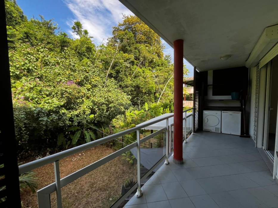 Profitez d'un salon lumineux qui s'ouvre sur une terrasse spacieuse avec vue sur la forêt, d'une cuisine aménagée ainsi que d'une chambre climatisée.