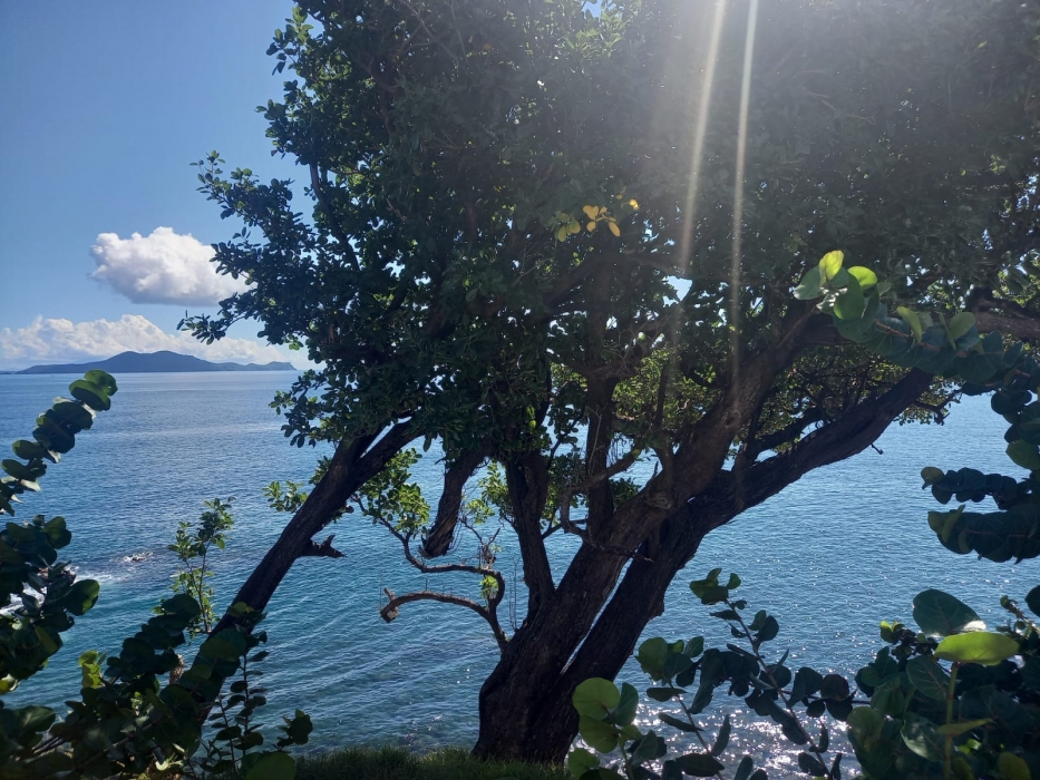 De larges baies vitrées offrant une vue dégagée sur la mer et les Saintes.