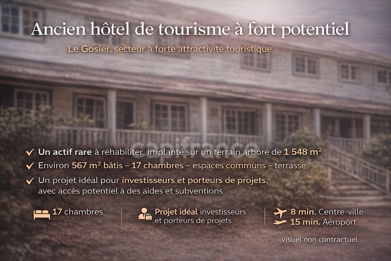 Implanté sur la commune du Gosier, secteur à forte demande touristique, cet ancien hôtel de tourisme s'inscrit dans un contexte propice aux projets de réhabilitation et d'investissement, avec un accès potentiel à différents dispositifs d'aides et de subventions, selon le projet envisagé.