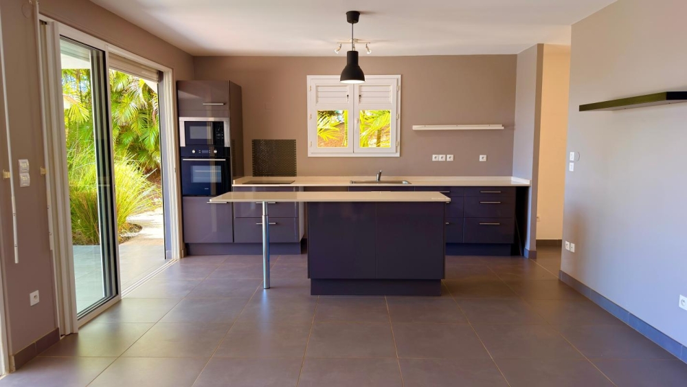 Une cuisine équipée, fonctionnelle avec rangements et ilôt central, ouverte sur le séjour.