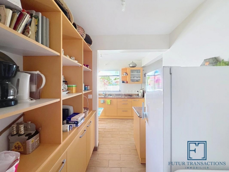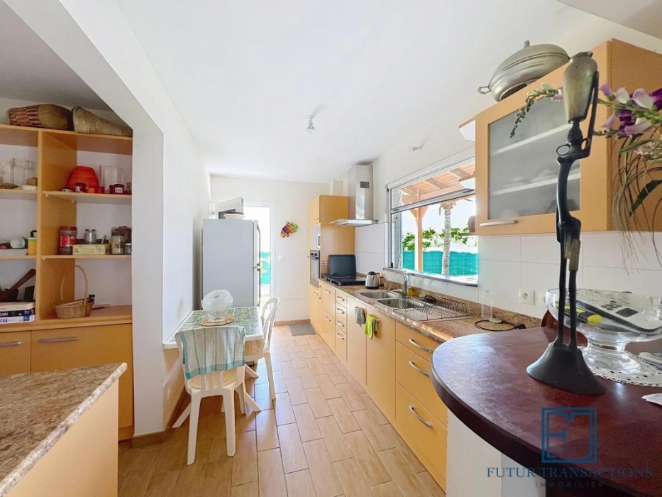Une cuisine aménagée/équipée avec cellier, ouverte sur séjour lumineux de 32 m² et terrasse couverte de 30 m².