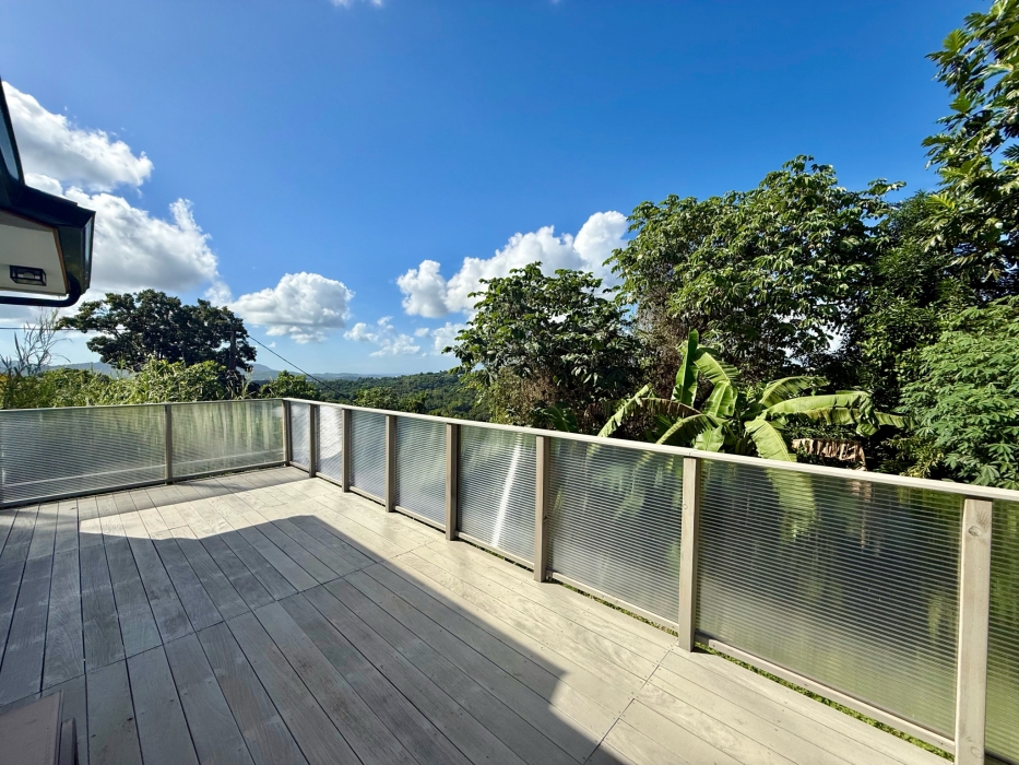 Vous profiterez d'une terrasse couverte à l'avant de la maison, idéale pour vos moments de détente, ainsi que d'une terrasse en bois à l'arrière donnant sur un jardin verdoyant et une vue dégagée.