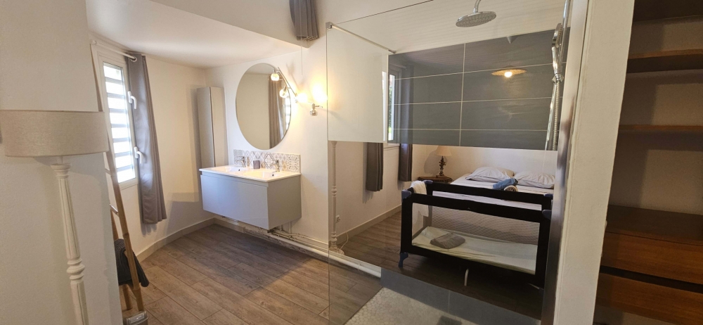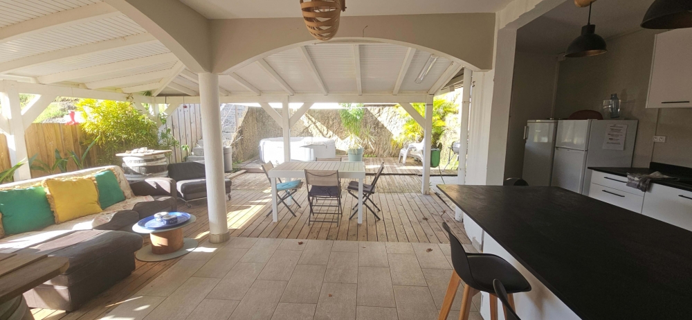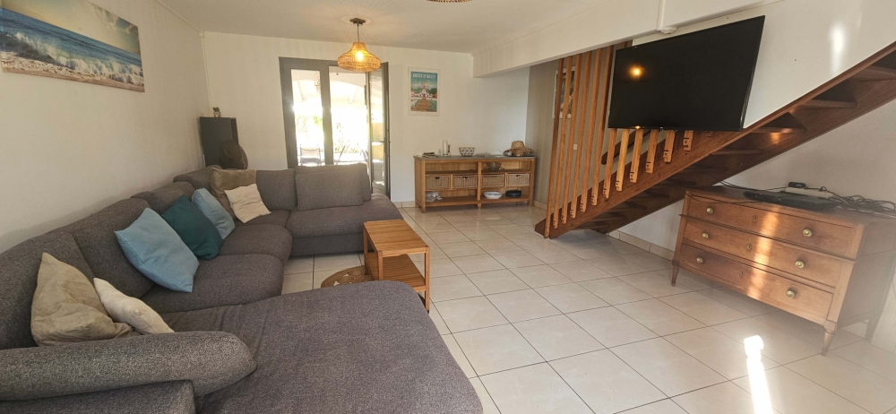 Elle se compose, au rez-de-chaussée, d’un agréable séjour, d’une salle d’eau avec WC et coin buanderie, ainsi que d’une spacieuse terrasse de 40 m2 agrémentée d’une jolie cuisine aménagée et d'une petite cave en bois. À l’étage, trois chambres climatisées, dont une avec son coin salle d’eau ? un dégagement avec grand espace de rangement, ainsi qu’une salle d’eau avec WC. Pour vos instants de détente, un jacuzzi gonflable complète ce bien. Il est également possible d’implanter une piscine, soit en bout de terrasse, soit sur le plateau jardin d’environ 150 m2 situé au-dessus de la terasse. Laissez-vous séduire par cette maison au fort potentiel, située à quelques minutes à pied des plages et des commodités de Sainte-Luce.Un véritable havre de paix.