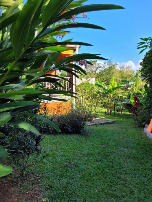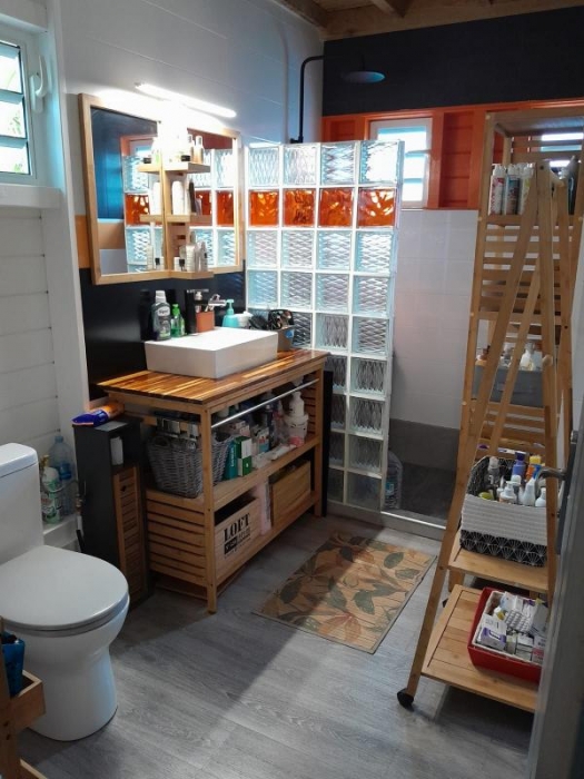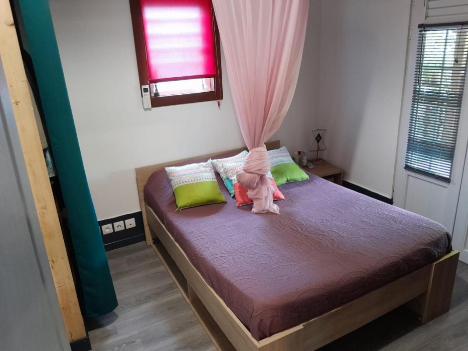 Le second bungalow se compose d'un séjour avec coin cuisine, une chambre, un bureau pouvant servir de deuxième chambre, une salle d'eau et une terrasse également.