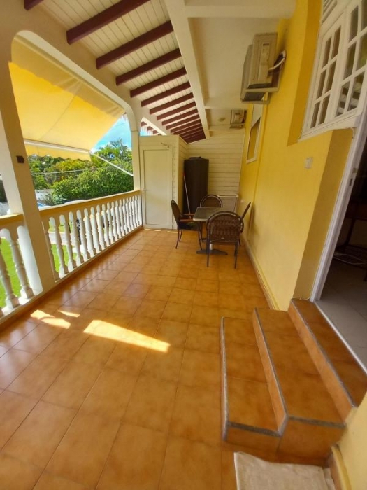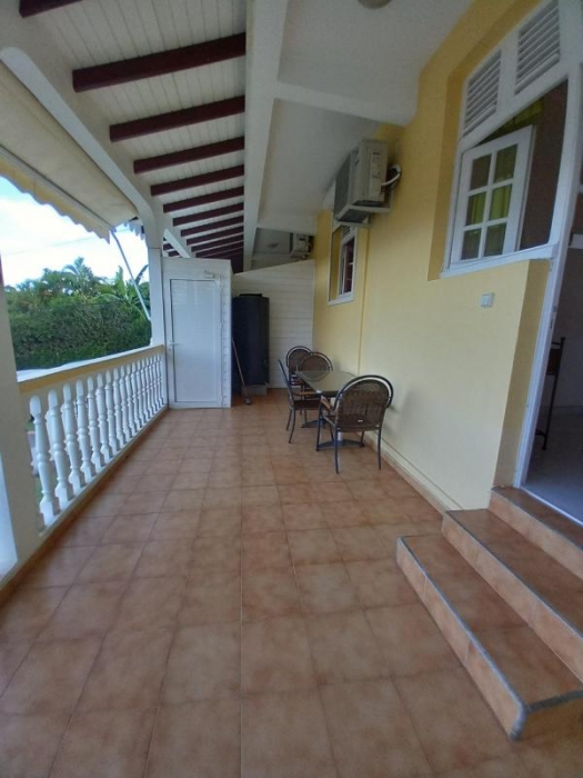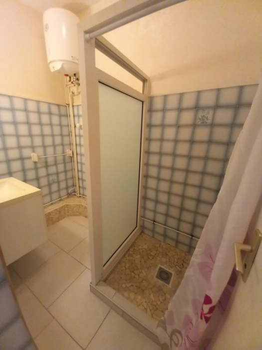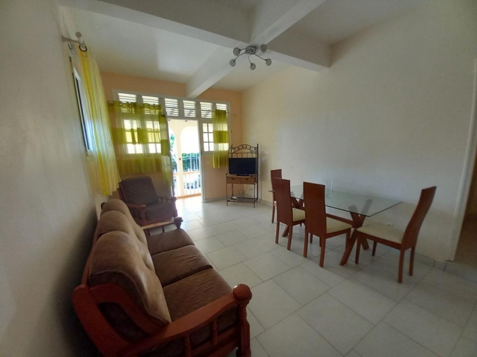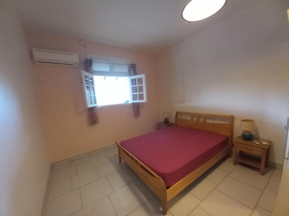 Appartement type T2 meublé en bas à droite d'un bâtiment avec petite terrasse couverte et fermée. Il est composé d'un séjour ouvert sur une cuisine aménagée et équipée, salle d'eau, wc indépendant, une chambre climatisée.