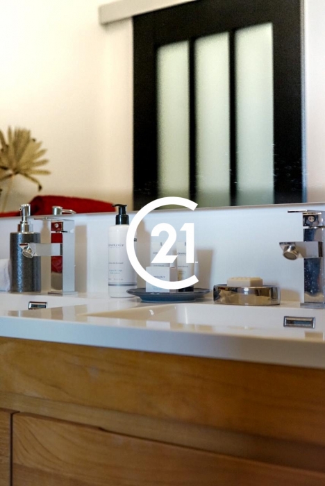 La cuisine indépendante, aménagée et équipée, est un véritable atout pour les amateurs de gastronomie. Les ouvertures en aluminium et les portes à simple vitrage apportent une touche moderne et lumineuse à l'ensemble.
