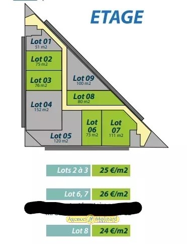 Loyer mensuel Hors taxes Hors charges : de 24 euros à 26 euros / m² (par exemple lot 02 1875€ HT HC mensuel)