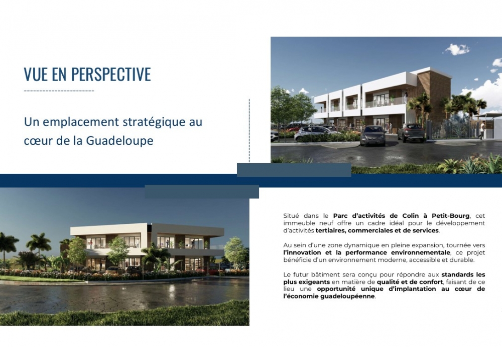 Implanté au cœur de la Guadeloupe, dans le Parc d’activités de Colin à Petit-Bourg, ce futur immeuble tertiaire bénéficie d’un emplacement stratégique à proximité immédiate des axes reliant Basse-Terre, Jarry et Pointe-à-Pitre. Un site central, accessible et dynamique, idéal pour les entreprises en développement.