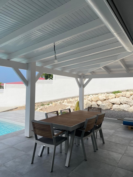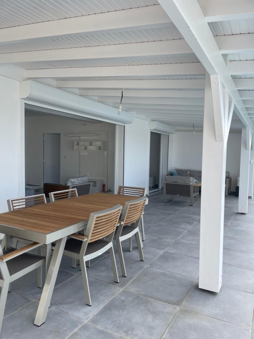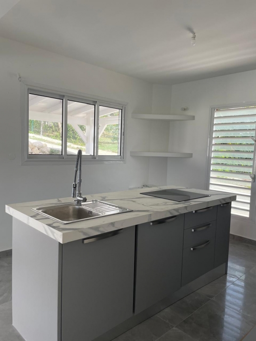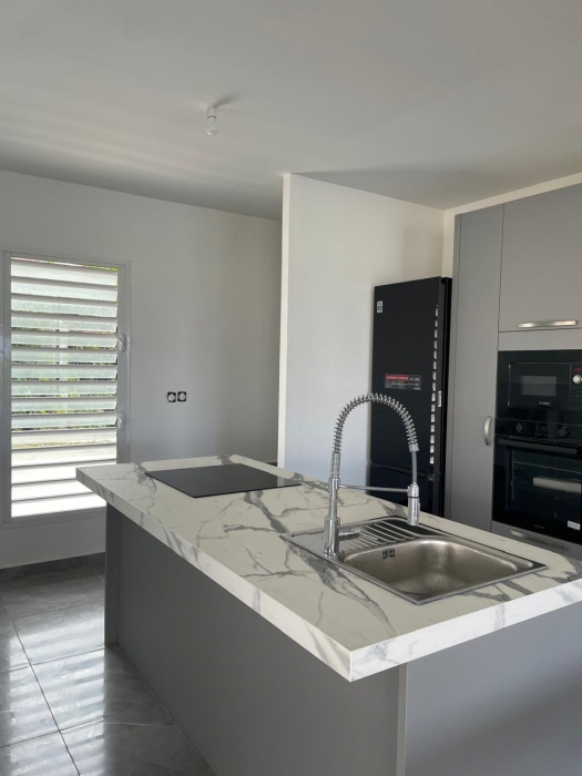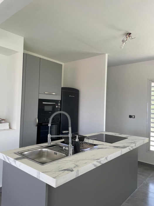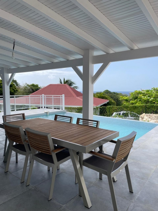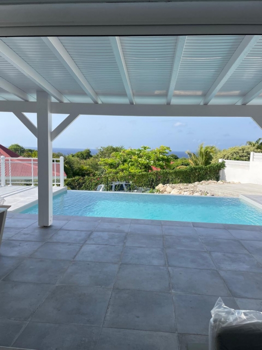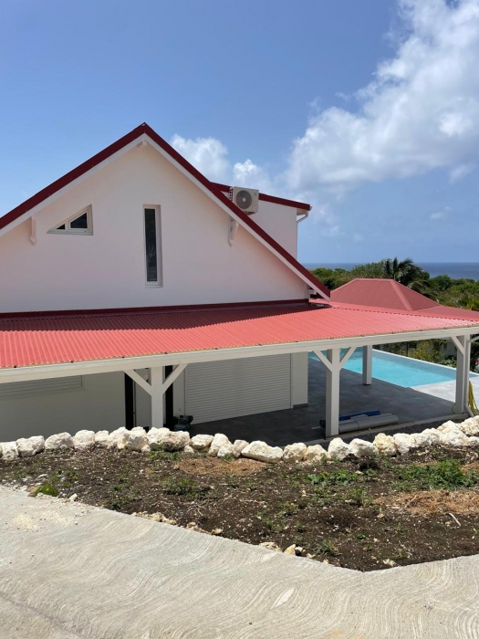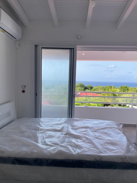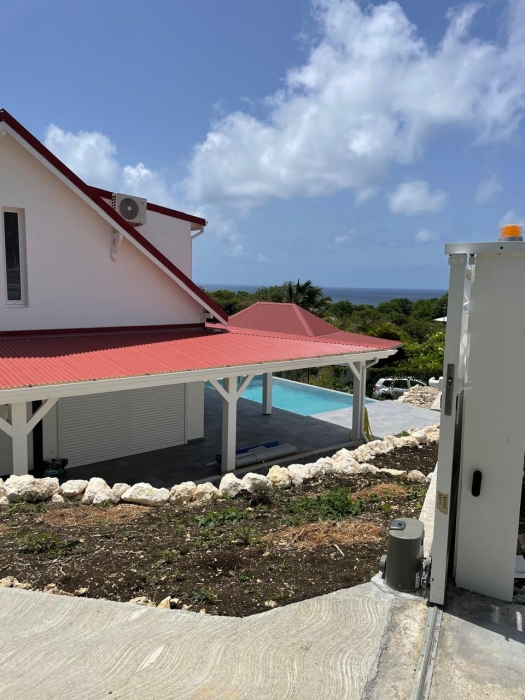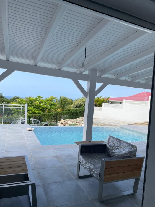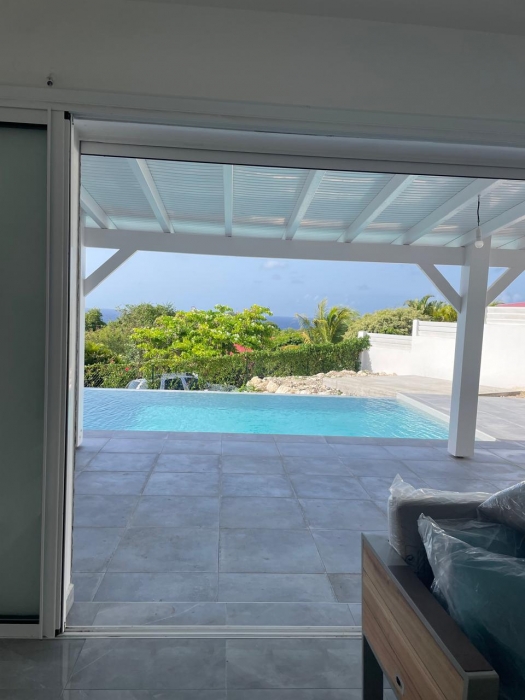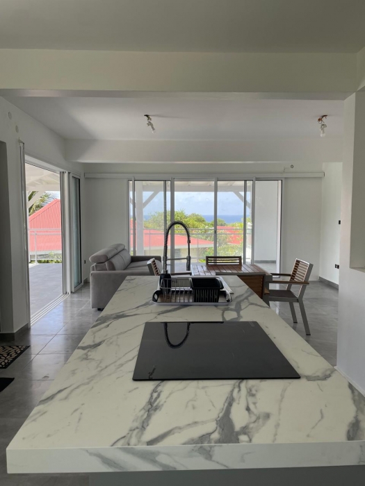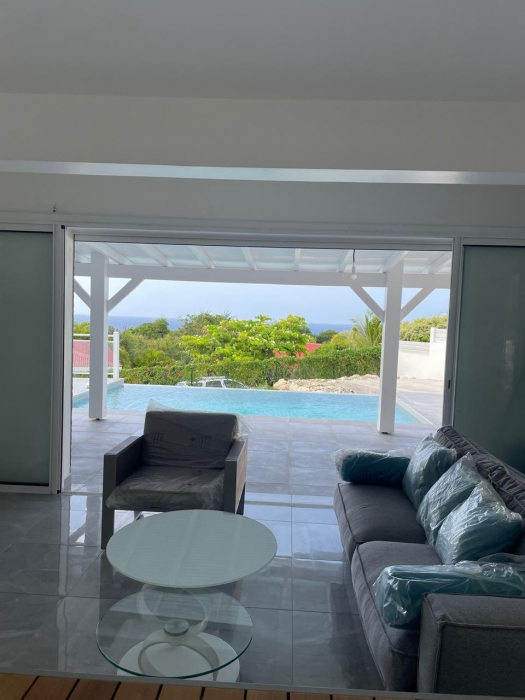 Dans un environnement calme et sans odeurs de sargasses, cette magnifique villa neuve offre tout le confort d'un lieu de résidence de standing meublé. Séjour confortable et cuisine américaine entièrement équipée (lave-vaisselle, fours, table de cuisson, réfrigérateur, vaisselle, placards...) avec un joli ilot central, un coin buanderie (lave-linge...), A cela s'ajoute une grande terrasse avec vue mer et vue sur la piscine. Les trois chambres jouissent aussi de la vue mer. Elles sont climatisées et dotées de leur propre salle d'eau. Le terrain de 800 m2, en dénivelé, offre deux places de parking. L'ensemble bénéficie d'un mobilier contemporain. Le portail est électrique. Pour le moment, ce bien est disponible...