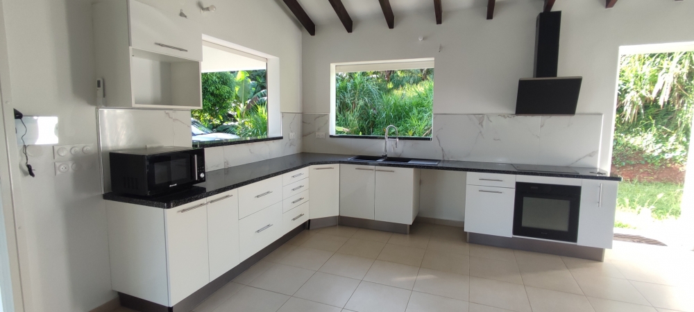 D'une superficie d'environ 100 m2, elle comprend très grand espace de vie, salon et cuisine ouverte aménagée, trois chambres climatisées avec placards dont une suite parentale attenante à sa salle d'eau avec toilette intégré et grand placard, une salle d'eau supplémentaire indépendante, deux toilettes indépendants dont un extérieur, une grande terrasse et un jardin cloturé.