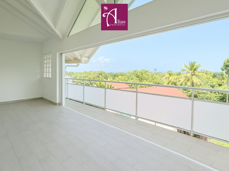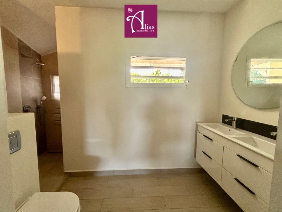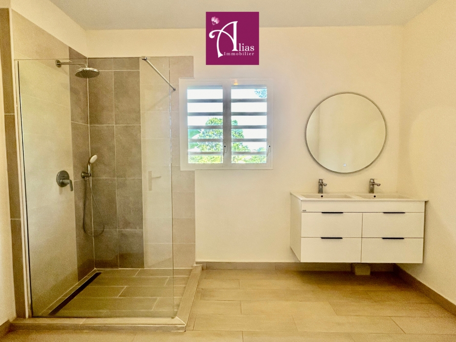Vous trouverez un séjour lumineux ouvert sur une cuisine équipée (avec plaque de cuisson 4 feux) et aménagée donnant sur une terrasse couverte de 31m2 offrant une belle vue dégagée. Vous trouverez également un WC indépendant, une grande suite parentale climatisée de 25,60 m2 avec dressing et salle d’eau attenante avec un WC.