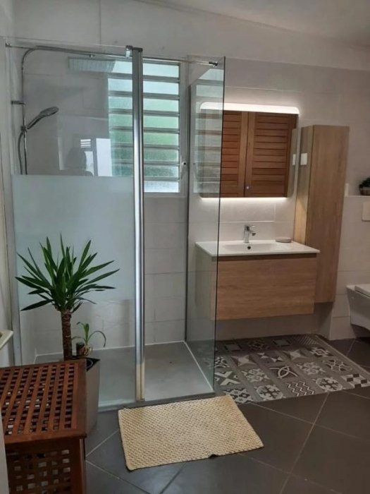 Villa T4 meublée 140m² habitable comprenant : 1 cuisine aménagée et entièrement équipée avec ilôt central donnant sur 1 séjour, grande mezzanine avec rangement, 3 chambres climatisées dont 1 chambre parentale avec sa salle d'eau, 1 dégagement avec placard, 1 salle d'eau avec placard intégré et wc, 1 wc indépendant, 1 cellier, 1 dressing, 1 grande terrasse avec deck tout autour de la maison, petite piscine, jardin clôturé de 400m².