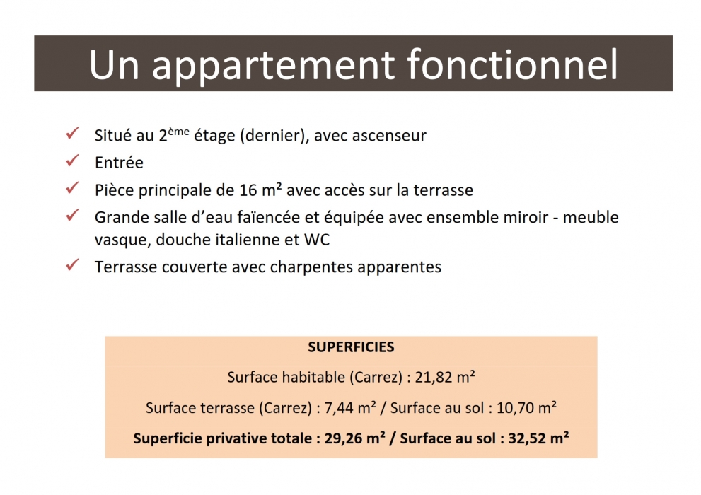 Cet appartement de 21,82 m2 habitable (carrez) auxquels s'ajoute la terrasse couverte de 7,44 m2 (10 m2 surface au sol) vous séduira par son élégance et ses finitions.