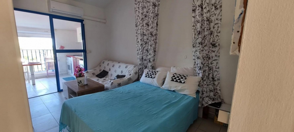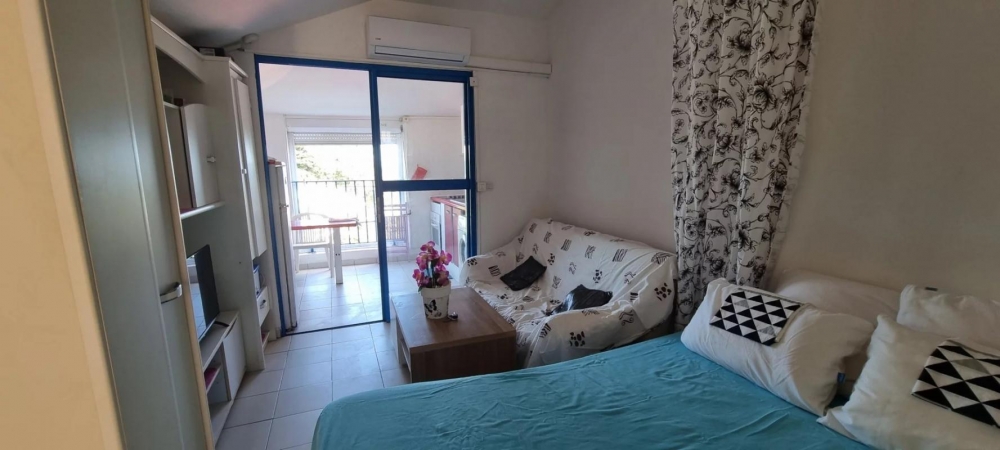 Ce studio est composé : d'une pièce principale, une salle d'eau avec toilette et une loggia avec cuisine aménagée.