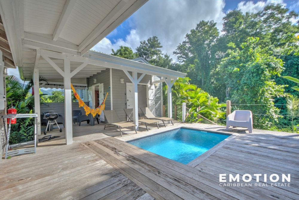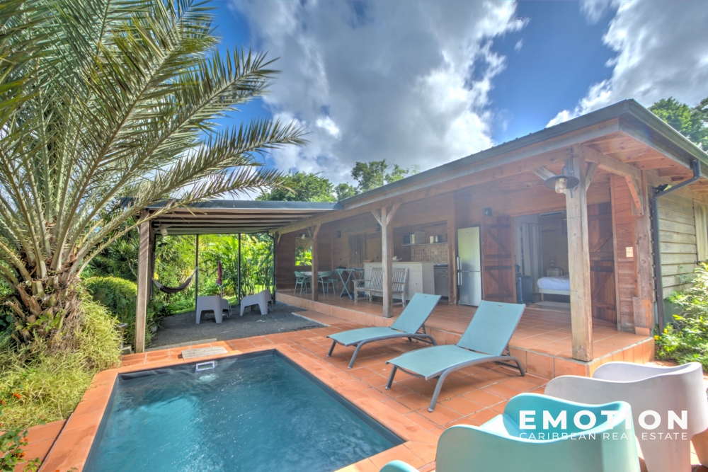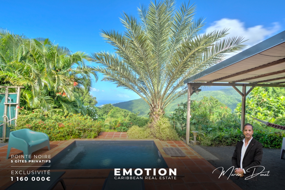 Le Cabinet Emotion Real Estate Guadeloupe vous présente à la vente un lot de 5 gîtes indépendants avec vue mer et vue montagne. La situation géographique du bien vous permet d’éviter d’être niché en pleine nature sans aucun vis à vis dans un environnement rempli de verdure calame et reposant. Situé à 10 minutes de plage de malendure à Bouillante. GÎTE no1 : La Belle Etoile Le gîte de la Belle étoile peut accueillir 4 personnes ou 6 personnes lorsqu'elle est combinée avec la Discrète. Le gîte de la belle étoile offre 2 grandes chambres climatisées, meublées en style créole, 2 salles de douches. Une grande terrasse, un salon confortable, une salle à manger pouvant accueillir 6 personnes et sa cuisine équipée. Un Deck et une piscine 2x3. Une vue spectaculaire sur la mer des Caraïbes et la montagne de Basse - Terre d'où émane une sérénité absolue. GÎTE no2 : Le Bois Dormant Le Bois Dormant saura vous séduire. De votre terrasse, vous découvrirez le panorama d'une vallée dominant le bleu de la mer caraïbe, avec, au loin l'île de Montserrat. À l'est, s'élèvent les arbres majestueux de la forêt tropicale.