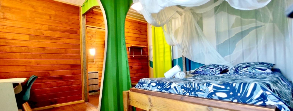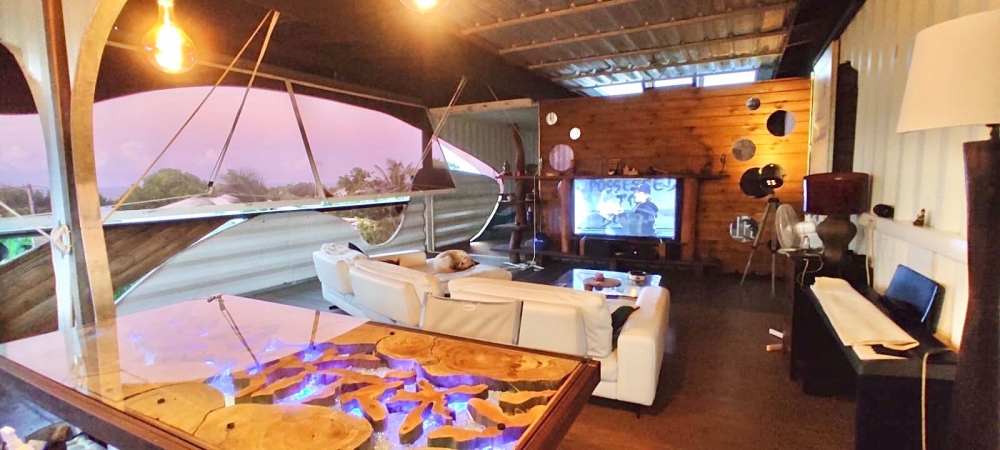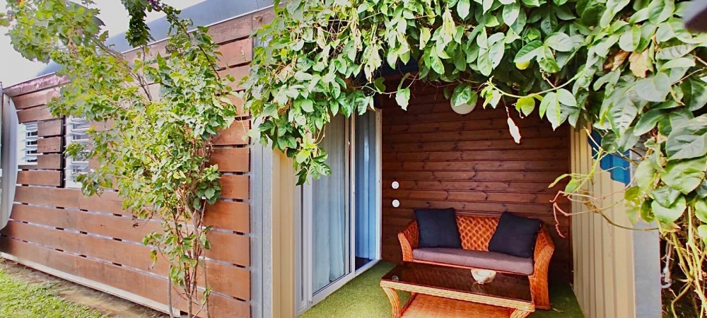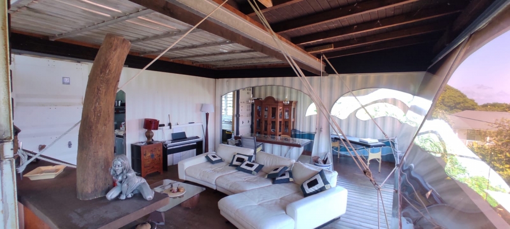 Le terrain arboré et clos de 1 500m2 avec deux portails comprend une grande bâtisse principale de 248m2 construite en containers et bois (format colonial 20 x 10m sur 2 niveaux), un bungalow en bois indépendant de 72m2 avec garage fermé de 24m2 et appartement T2 de 48m2. Surface totale plancher porteur de 320m2 dont 158m2 habitables.