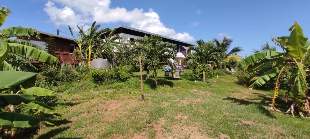 Construction 2019 antisismique et anticyclonique avec garantie décennale. Située en zone blanche PPRN avec PLU haute densité. Équipements écoresponsables : bassin de récupération d'eau de pluie, filtration naturelle des eaux usées (coco + UV), chauffe-eau solaire 300L, éclairage 12V, fibre optique et vidéosurveillance complète.
