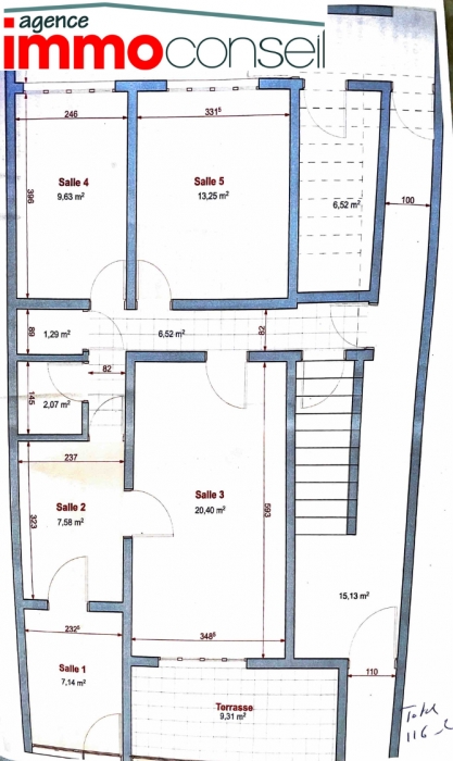 Il se compose : RDC = Une pièce principale de 20,40 m2 avec ouverture sur une terrasse de 9 m2 , 2 pièces de 7 m2 accolées desservi par un couloir de 6,52 m2 avec une salle d'eau de 2,07 m2 et un WC séparé de 1,29 m2 . À l'arrière, vous trouverez deux pièces pouvant servir de chambres ou de bureaux ouvert sur une terrasse de 8 m2.