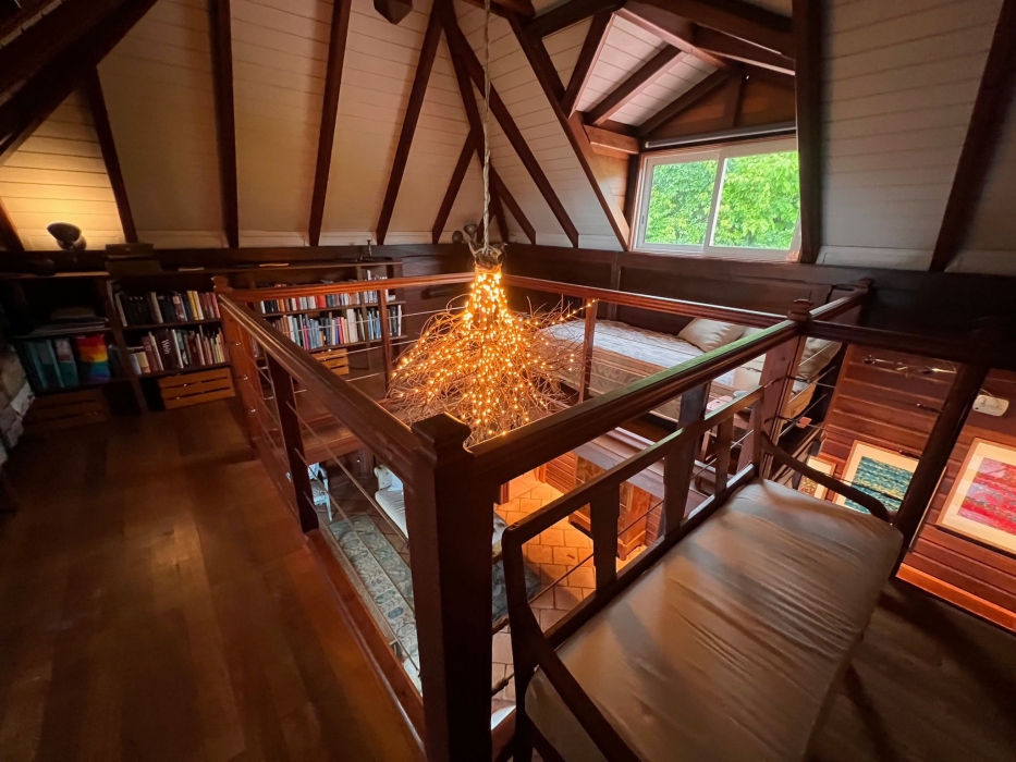A l'étage, le logement principal d'une surface de 100 m2 vous séduira par ses volumes généreux et son ambiance chaleureuse : deux suites parentales pour accueillir famille ou invités avec confort, un séjour sublimé par une charpente apparente et une mezzanine en coursive avec coin bureau, une cuisine ouverte avec cellier attenant, idéale pour les moments de convivialité.