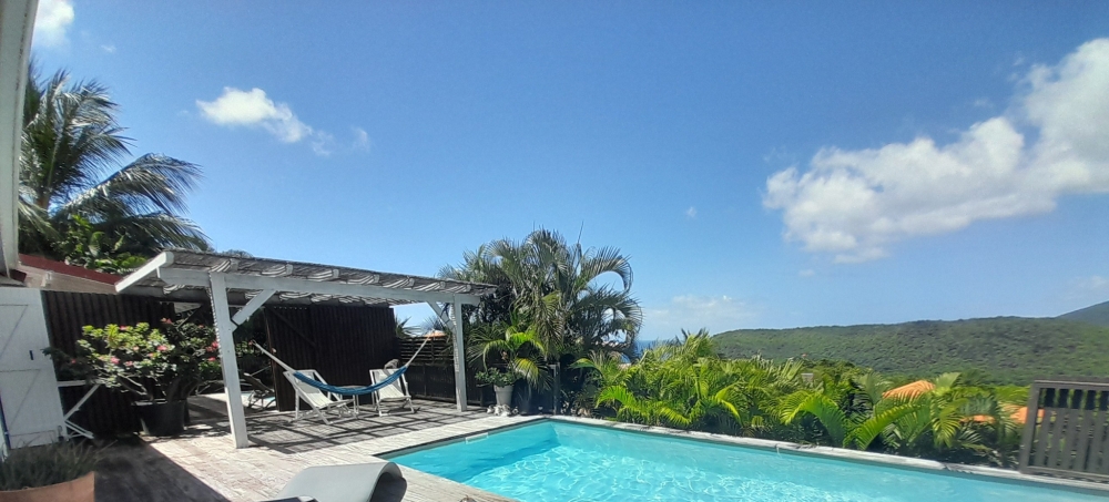 Cette maison de plain pied, construite sur une parcelle de 549m2, bénéficie d'une jolie vue dégagée sur les mornes et sur la mer..