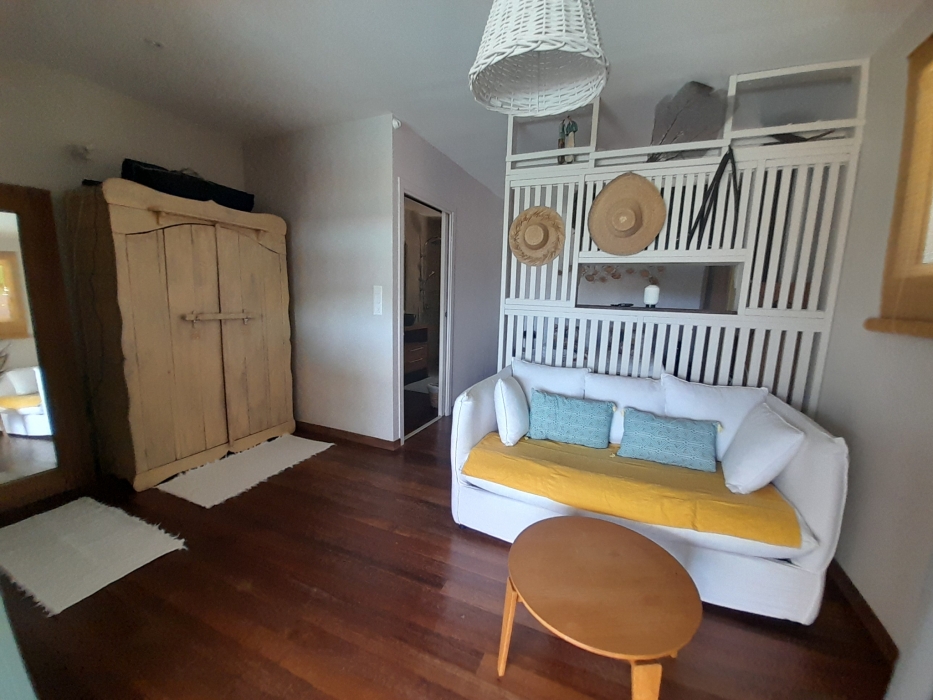 De l'autre côté un T1 bis avec une cuisine /coin repas, un séjour communiquant sur une chambre climatisée, une salle d'eau, un espace buanderie, une terrasse couverte et une petite piscine privative.