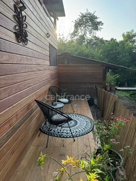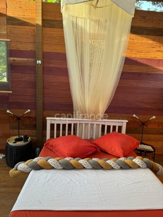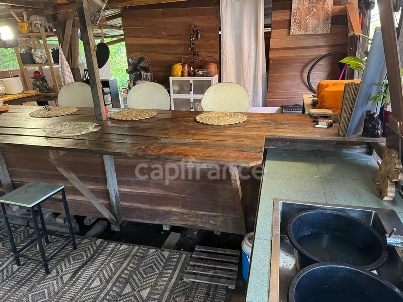 Vous y trouverez un joli carbet ouvert tout en frise de type T3, construit en 2024 mais encore à terminer.